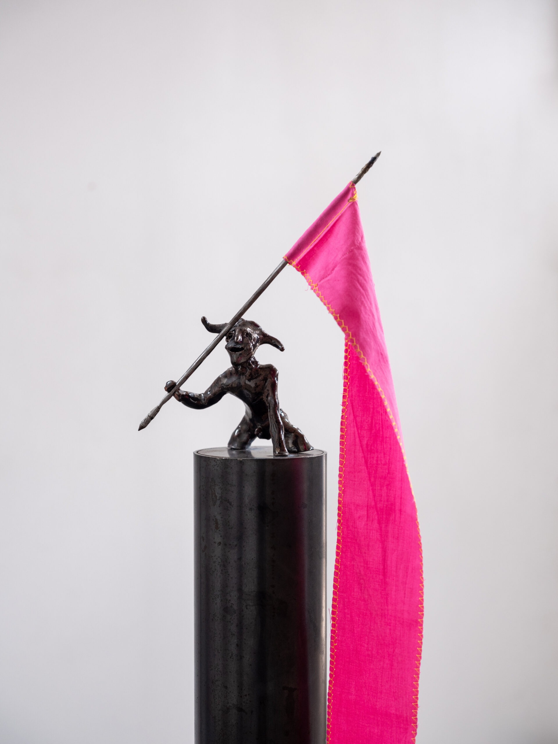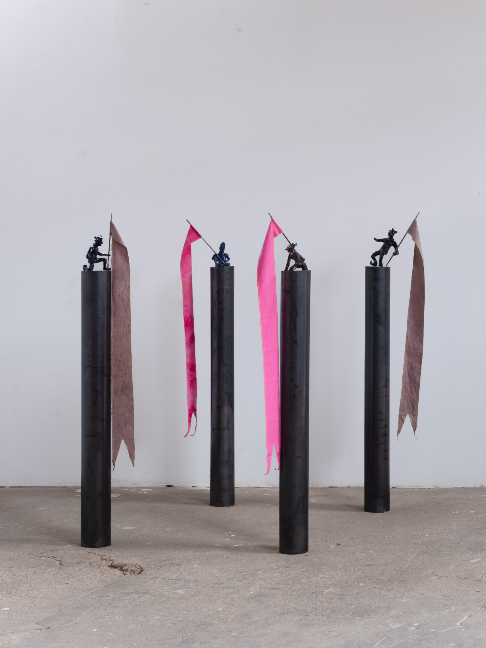 Dans cette dynamique, je glane, récupère ou rejoue des éléments architecturaux, mobiliers ou décoratifs, qui deviennent parties prenantes du corps de la sculpture. Des créatures composées d’acier, de cire ou de céramique s’entrelacent à des chaises et des tables. Les masques anthropomorphes qui ornent les jardinières devant l’atelier se déplacent et prennent vie sur un squelette d’acier, tandis qu’un groupe de personnages tente maladroitement de se stabiliser, fermement accroché à leurs étendards.