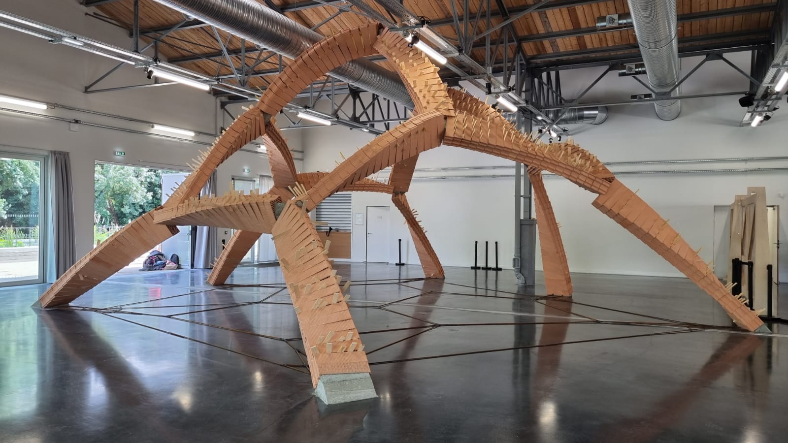 Il dit de sa pratique qu’elle est « de l’ordre du bricolage ». Comme pour un jeu de Lego géant, Vincent Ganivet assemble et superpose des parpaings, des briques, entre autres objets peu maniables, détournant en virtuose les codes du BTP. C’est que le quadragénaire a longtemps travaillé sur des chantiers : il en garde une obsession pour les matériaux lourds et bruts. Avec cette encombrante matière première, Vincent Ganivet élève des arches, des courbes et des coupoles qui évoquent, par moments, des squelettes de cathédrales romanes.
