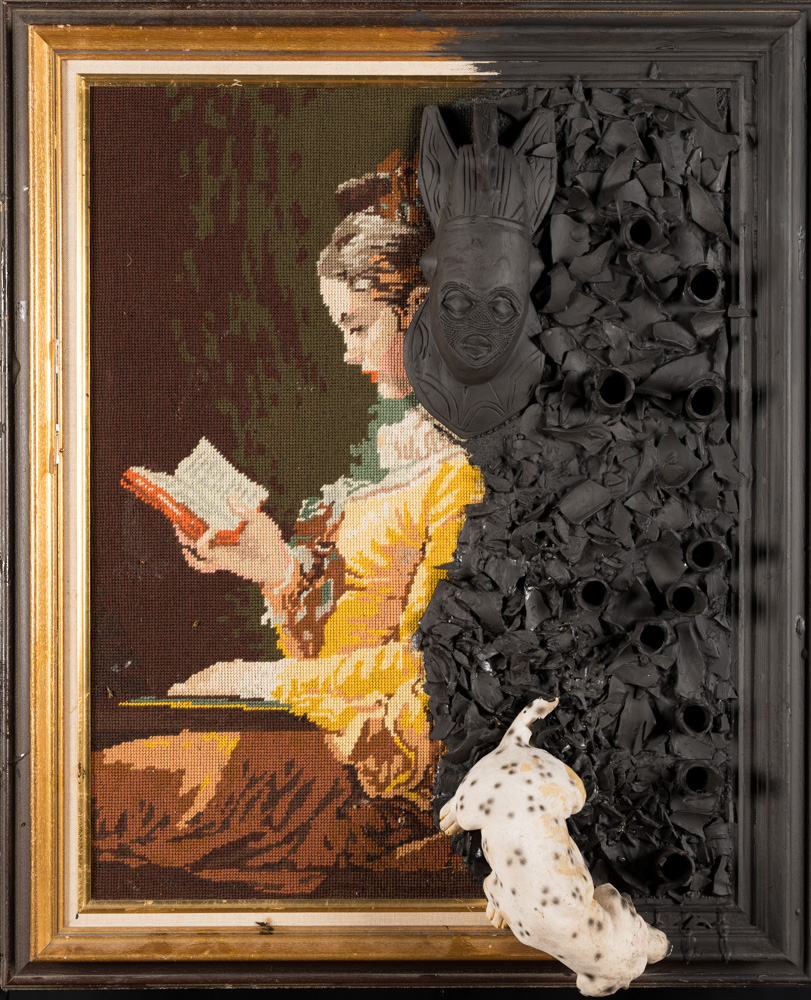 Enfin depuis peu la couleur revient subrepticement avec la série teintée d’humour noir iconoclaste, des Toiles de Maitre, où des canevas sont noircis et augmentés de boiseries rustiques ou ethniques.