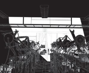 L’artiste documente ses visites d’ateliers par la photographie : l’espace, la lumière, les machines, les productions — mais aucune présence humaine. Ces images, simples relevés, ne sont pas une fin en soi. C’est le dessin qui prend le relais, pour prolonger la remémoration des lieux, rester longtemps avec l’image, dans l’image. Certaines zones sont occultées par des aplats noirs — zones enfouies, mises en réserve — tandis que le reste se redessine point par point, générant une vision intérieure du lieu. Chaque dessin trame ainsi sa propre représentation mentale, comme une salle de mémoire.