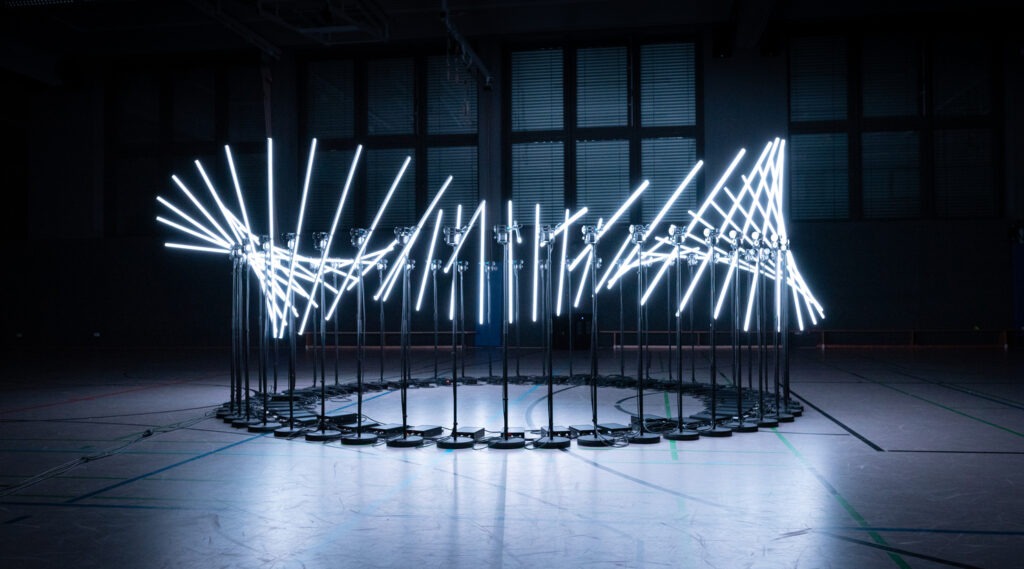 Forme mutante et modulaire, la multiplication formelle des lignes lumineuses couplées à un contrôle exigeant de la motorisation permet à Scale de s’amuser avec de subtiles variations de phases, de vitesses et d’amplitudes pour sculpter un objet organique et tangible. Adaptable à son environnement, Flux redessine ce qui l’entoure et propose un spectacle avant-gardiste, ludique et poétique dans lequel la chorégraphie lumineuse dialogue intimement avec la musique. Musique: Grégory Sémah et Omeyr Abd Rabbo.