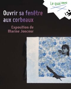 Au Quai (294M9), l’exposition chemine dans les espaces en enfilade où la lumière décline progressivement et impose une forme de crépuscule propice à l’expérience narrative proposée par l’artiste. Au mur, les toiles de tissus fleuris et colorés, parfois rehaussées de petits os, sont le support d’une double projection : celle de la peinture qui met en scène une jeune fille et des oiseaux, batraciens ou marcassins, auxquelles se superposent des animations vidéo. Des animaux apparaissent ainsi par intermittence et leurs présences fugitives suggèrent une relecture des images fixes. Peintures hybridées, sculptures hybridées (dont la surface n’est pas celle à laquelle on s’attend), rien n’est ce qui parait être au premier regard dans les pièces de Marine Joncour. Dans ce travail la relation au naturel n’est pas irréparable, le domestique n’est jamais vraiment dompté, le sauvage n’est pas celui que l’on croit – comme nous le prouve la sélection de textes déployés dans l’espace.