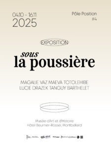« Sous la poussière » réunit à nouveau les artistes de la 4e édition du programme Pôle Position, dédié à la jeune création en Bourgogne Franche-Comté. Après avoir exploré les ruines incandescentes dans « Sur les cendres » au Musée des Beaux-Arts de Dole, ce deuxième volet s’installe au musée Beurnier Rossel, ancienne demeure bourgeoise dont les murs portent encore la mémoire des vies passées. Ici, le travail se resserre. Dans l’intimité d’un intérieur marqué par le temps, les œuvres se frottent aux traces laissées, aux résidus parcellaires qui tapissent la mémoire des lieux. Entre poussière et oubli, elles révèlent ce qui se cache dans les interstices : des bribes de souvenirs, des échos de luttes intérieures, des gestes qui tentent de faire surgir ce qui semblait effacé. « Sous la poussière » interroge ce que l’on garde et ce que l’on enfouit, ce qui persiste malgré l’effacement. Une traversée fragile et fragmentée, où chaque particule devient la promesse d’une présence retrouvée. Carte blanche à SEIZE MILLE Réseau Art Contemporain Bourgogne - Franche - Comté Dans le cadre de la 4ème édition du programme Pôle position, soutien à la jeune création en Bourgogne – Franche-Comté.