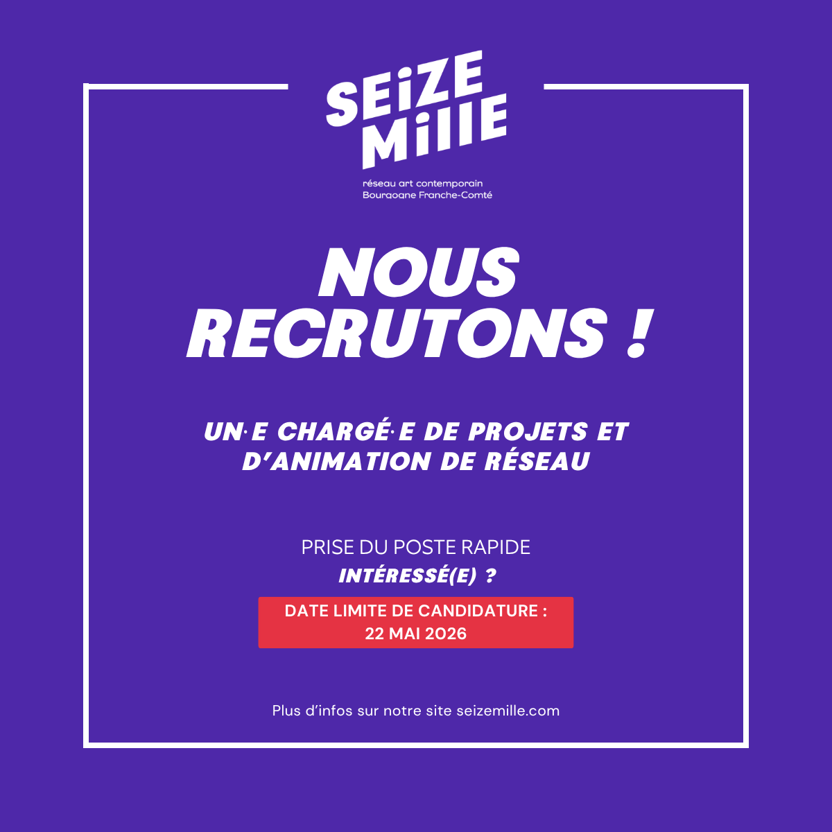 Candidature (CV + lettre de motivation) à envoyer avant le 22 mai 2026